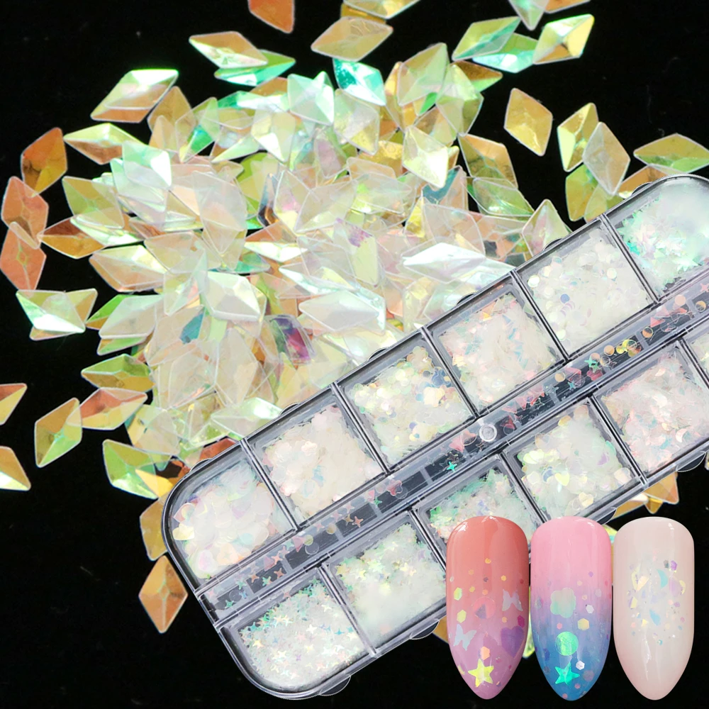 12 Grids Mixed Holographic Sequins Nail Glitter Flake Sugar Mermaid Mirror Design Polish Nail Art Decorations Pigment Dust TR067
